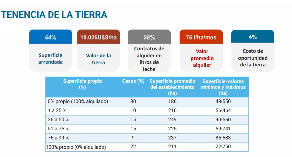 Este mosaico evidencia la coexistencia de modelos familiares con unidades productivas de gran porte, siendo relevante que el 54% de la superficie para tambos es arrendada, con un valor promedio de 10.025 dólares por hectárea al año, siendo de 214 hectáreas la media por tambo.