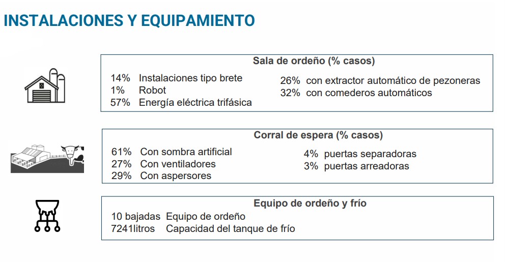 La infraestructura muestra avances respecto de otras encuestas, ya que el 61% de los tambos cuenta con corrales de espera con sombra, 29% tiene ventiladores. Apenas 1% de ellos tiene robots de ordeño, lo que marca una brecha tecnológica aún incipiente en automatización completa.