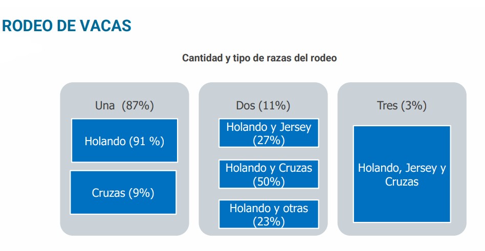 Con rodeos Holando en el 91% de los casos relevados, el 68% utiliza inseminación artificial, 52% semen sexado y 32% ecógrafos, marcándose una estrategia de mayor manejo de biotecnología aplicada en el eslabón primario.