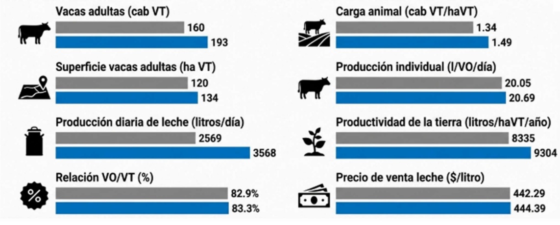 Los resultados productivos en el ordeño reflejan un promedio de 18 a 24 litros por vaca/día, siendo el promedio diario por tambo de 3.568 litros, con una productividad anual de 6.289 litros por animal, en la relación actualizada de 134 vacas totales por hectárea.
