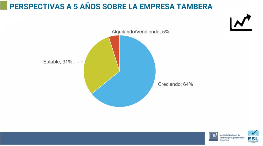 Sin embargo, el 64% de los productores proyecta crecer en los próximos cinco años, 31% mantenerse estables y solo 5% alquilar o vender. Los riesgos más señalados son la variabilidad climática (24%), el incremento de costos (19%), la dificultad para conseguir mano de obra (17%), la volatilidad del precio de la leche (16%) y las políticas sectoriales erráticas (11%).